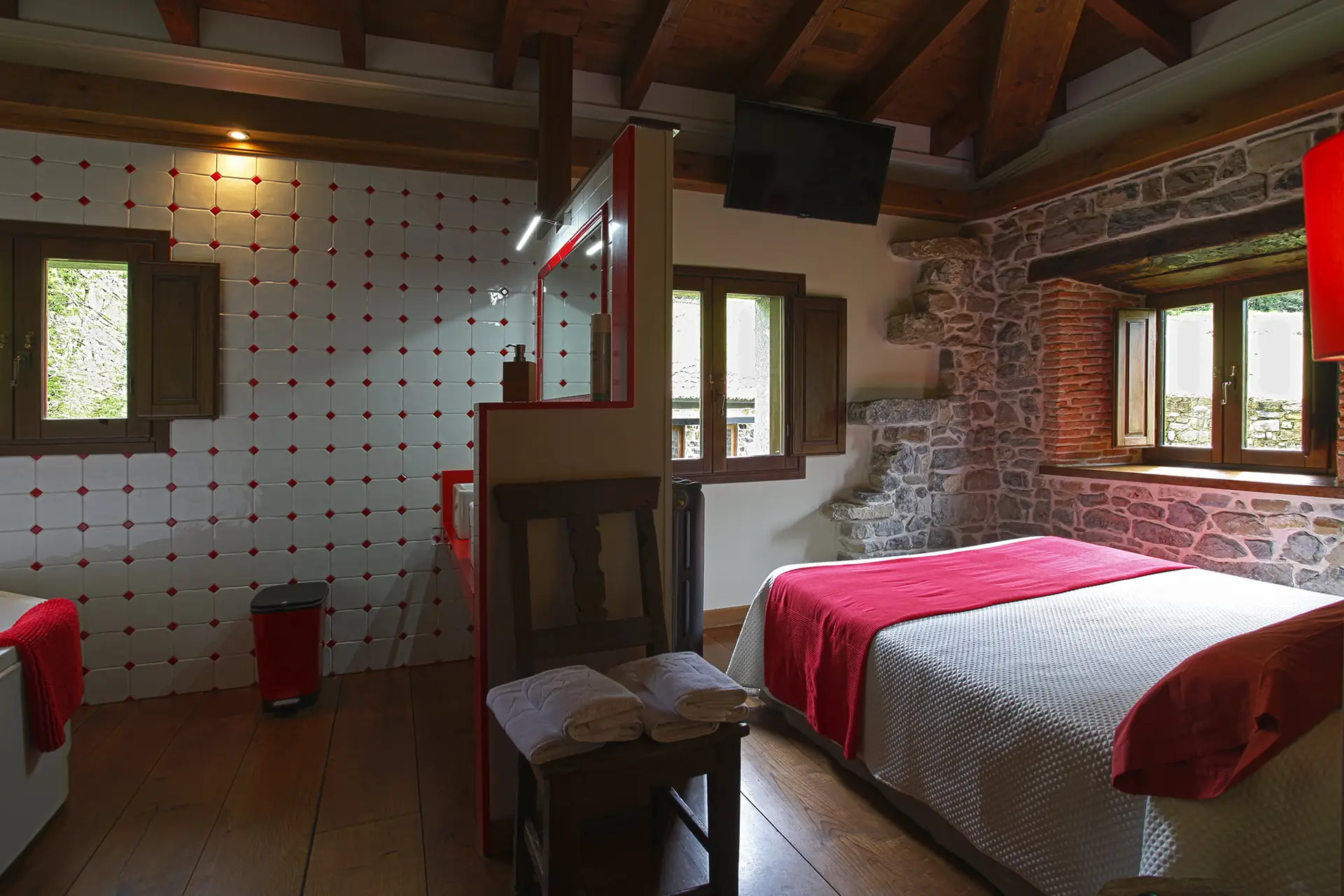 La suite Este dispone de amplios espacios. Ideal para una estancia en familia o en pareja confortable. Decorada en colores rojo y blanco, que le aporta un toque romántico. Dispone de 3 estancias. Muy luminosa, con 3 ventanas y un balcón con excelentes vistas al entorno que nos rodea: los jardines y fincas, el valle de Serrapio, y la montaña asturiana.